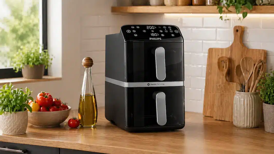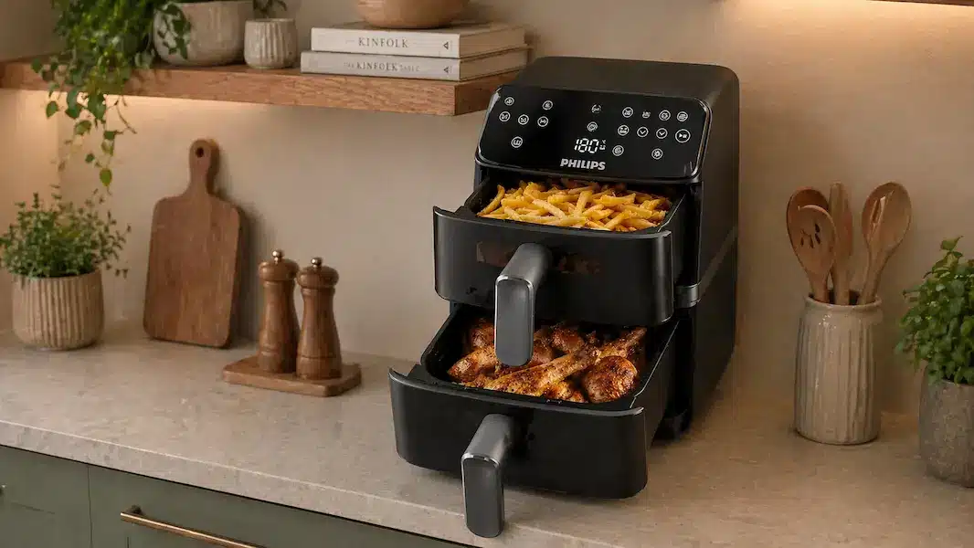 Trouver un air fryer familial sans sacrifier son plan de travail ressemble souvent à la quadrature du cercle. Les modèles à double tiroir qui permettent de cuire un plat et son accompagnement en simultané exigent habituellement 40 à 50 cm de largeur, soit une surface que peu de cuisines peuvent se permettre de céder. Philips tente une réponse originale avec son Vertical Duo Série 4000, un modèle qui empile ses deux compartiments au lieu de les aligner.